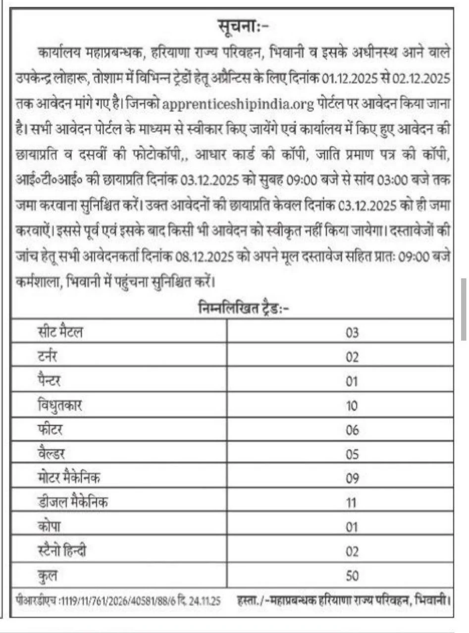 Recruitment Organization Haryana Roadways (Bhiwani) Post Name Apprentice Total Post 50 Last Date 02 December 2025 Application Type Online Job Location Bhiwani (Haryana) Official Website apprenticeshipindia.gov.in Join Telegram Channel Click Here Join Whatsapp Channel Click Here