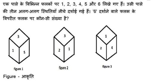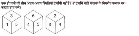 81. एक पासे के अलग-अलग फलकों पर छह संख्याएँ – 1, 2, 3, 4, 5 और 6 लिखी गई हैं। दिए गए चित्र में इस पासे की दो स्थिति दर्शाई गई हैं। 2 दर्शाने वाले फलके के विपरीत वाले फलक पर कौन-सी संख्या होगी?