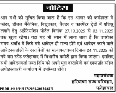 General Manager Haryana Roadways, Fatehabad has released the notification for the post of Apprentice. This recruitment has been issued for 45 post . Online applying process for Fatehabad Roadways Apprentice 2025 has started from 27 October 2025 & the candidates can apply till 03 November 2025. Candidates must check the complete details for Fatehabad Roadways Apprentice 2025 which has given below.