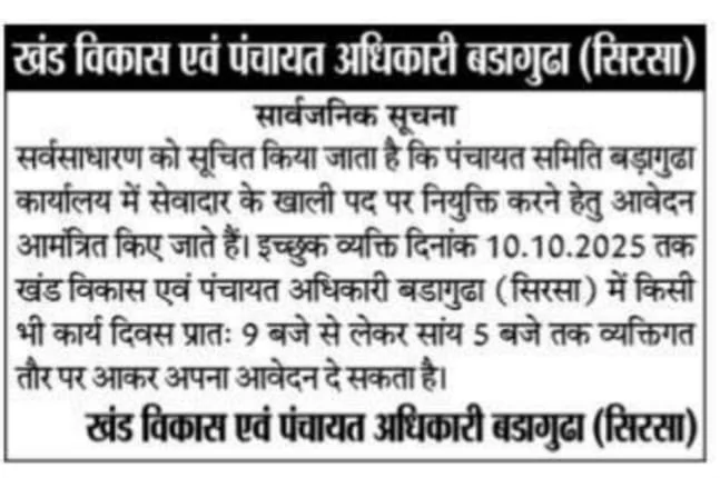 Recruitment Organization Block Development and Panchayat Officer Office Post Name Sewadar (सेवादार) Total Vacancy Read Notice Last Date 10 October 2025 Application Type Offline Job Location Haryana Join Telegram Channel Click Here Join Whatsapp Channel Click Here
