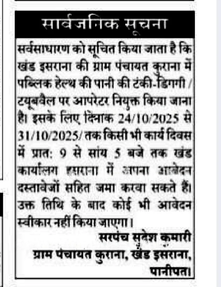 Haryana Tubewell Operator Recruitment 2025: The Block Development and Panchayat Department, Panipat, has released a notification for the recruitment of Tubewell (Jalkarmi) Operators on a contract basis for various villages in Fatehabad District. Interested and eligible candidates can apply through the offline form starting from 23 October 2025. The last date for submission of the form will vary village-wise, so applicants must submit their forms on the respective dates mentioned in the official notice.