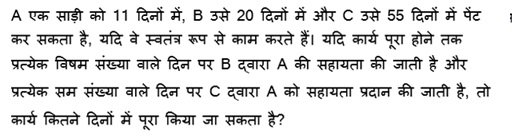 12. “A, B, C एक के बाद एक इस क्रम में कार्य करते हैं। उनमें से प्रत्येक अलग-अलग किसी कार्य को क्रमशः 10, 16, 12 दिन में पूरा कर सकते हैं। ABC, ABC, ABC ऐसे 3 चक्रों में कार्य करने के बाद, A और C कार्य छोड़ देते हैं। B अकेले शेष कार्य को _____ में पूरा करेगा।
