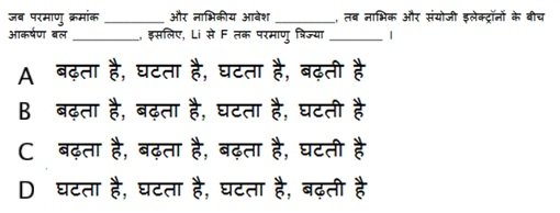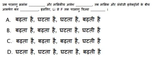 Railway Group D Reasoning & GS Mock Test-2 October 2, 2025 by Sarkari Form Team WhatsApp Group Join Now Telegram Group Join Now 133 Railway Group D Reasoning & GS Mock Test-2 1 / 25 1. दी गई अक्षर, संख्या, प्रतीक श्रृंखला का अध्ययन करें, और पूछे गए प्रश्न का उत्तर दें। T % N 9 - M S 3 U = L 8 Y @ G & 3 E > W 4 R F I K ऐसे प्रतीकों की कुल संख्या ज्ञात कीजिए, जिनके ठीक पहले एक संख्या और ठीक बाद एक अक्षर आता है। 1 2 4 3 2 / 25 2. उस विकल्प का चयन करें, जिसका पाँचवीं संख्या से वही संबंध है, जो दूसरी संख्या का पहली संख्या से है, और चौथी संख्या का तीसरी संख्या से है। 10 : 55 :: 12 : 65 :: 18 : ? 90 95 92 85 3 / 25 3. 2,1,1,1 1,1,2,1 3,1,1,1 1,1,1,1 4 / 25 4. E, F, G, H, I, J और K एक सीधी पंक्ति में उत्तर की ओर मुख करके बैठे हैं। H, G के बाएं ओर दूसरे स्थान पर बैठा है। F और K एक दूसरे के ठीक बगल में बैठे हैं। F और E दोनों I के बाईं ओर बैठे हैं। H और E एक दूसरे के ठीक बगल में बैठे हैं। K, पंक्ति के दाएं सिर पर बैठा है। J, H के बाईं ओर ठीक बगल में बैठा है। J के बाईं ओर ठीक बगल में कौन बैठा है? H F G E 5 / 25 5. उष्णकटिबंधीय सदाबहार वन भारत के इनमें से किस राज्य में पाए जाते हैं उत्तर प्रदेश गुजरात केरल राजस्थान 6 / 25 6. 25% 50% 21% 40% 7 / 25 7. A D C B 8 / 25 8. निम्नलिखित में से कौन से कथन सही हैं? (i) टिन-लेड मिश्र धातु का उपयोग फ्यूज तार बनाने के लिए किया जाता है। (ii) फ्यूज को विद्युत्चुम्बकीय तार से जोड़ा जाता है। (iii) फ्यूज बनाने हेतु चयनित पदार्थों का गलनांक उच्च होना चाहिए। (ii) और (iii) दोनों (i) और (iii) दोनों (i), (ii) और (iii) (i) और (ii) दोनों 9 / 25 9. निम्न अक्षर श्रृंखला के आधार पर पूछे गए प्रश्न का उत्तर दीजिए। Y H S D S V I R A Y E U G I R O A B U B R X M P Q उपर्युक्त श्रृंखला में ऐसे कितने स्वर हैं, जिनमें से प्रत्येक के ठीक पहले एक व्यंजन है, और ठीक बाद भी एक व्यंजन है? 3 2 5 4 10 / 25 10. What part of the respiratory system prevents the air-passage from collapsing? Trachea Spine Ribs Rings of cartilage 11 / 25 11. D A C B 12 / 25 12. क्लोर-एल्कली (chlor-alkali) प्रक्रिया में तीन उत्पाद, _______, ________ और ___________ उत्पन्न होते हैं। क्लोरीन, हाइड्रोजन, Na₂CO₃ क्लोरीन, ऑक्सीजन, Na₂CO₃ हाइड्रोजन, क्लोरीन, NaOH ऑक्सीजन, हाइड्रोजन, NaOH 13 / 25 13. X और Y, सोने और प्लेटिनम की दो मिश्रधातुएँ हैं, जो इन धातुओं को क्रमशः 5 : 2 और 5 : 7 के अनुपात में मिलाकर तैयार की गई हैं। यदि हम इन मिश्रधातुओं की समान मात्राओं को पिघलाकर एक तीसरी मिश्रधातु Z बनाते हैं, तो Z में सोने की मात्रा और प्लेटिनम की मात्रा का अनुपात क्या होगा? 73 : 95 95 : 73 84 : 73 95 : 84 14 / 25 14. "X और Y, सोने और प्लेटिनम की दो मिश्र धातुएँ हैं, जो इन धातुओं को क्रमशः 5:2 और 5:7 के अनुपात में मिलाकर तैयार की गई हैं। यदि हम इन मिश्र धातुओं की समान मात्राओं को मिलाकर एक तीसरी मिश्र धातु Z बनाते हैं, तो Z में सोने की मात्रा और प्लेटिनम की मात्रा का अनुपात क्या होगा? 84:73 95:73 73:95 95:73 15 / 25 15. D A B C 16 / 25 16. उस संख्या का चयन कीजिए, जो निम्नलिखित श्रेणी में प्रश्न चिह्न (?) के स्थान पर आएगी? 9, 10, 18, 45, 109, ? 198 327 218 234 17 / 25 17. निम्नलिखित में से कौन सा सम्बन्ध ओम के नियम (Ohm’s law) के सही गणितीय रूप का निरूपण 
